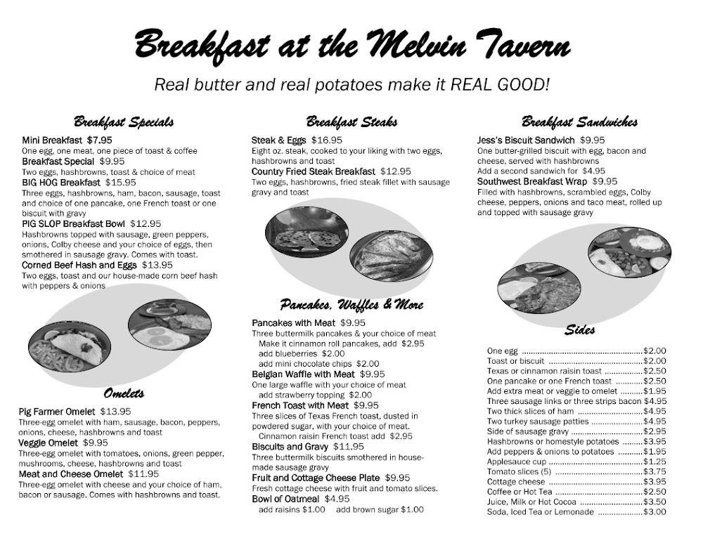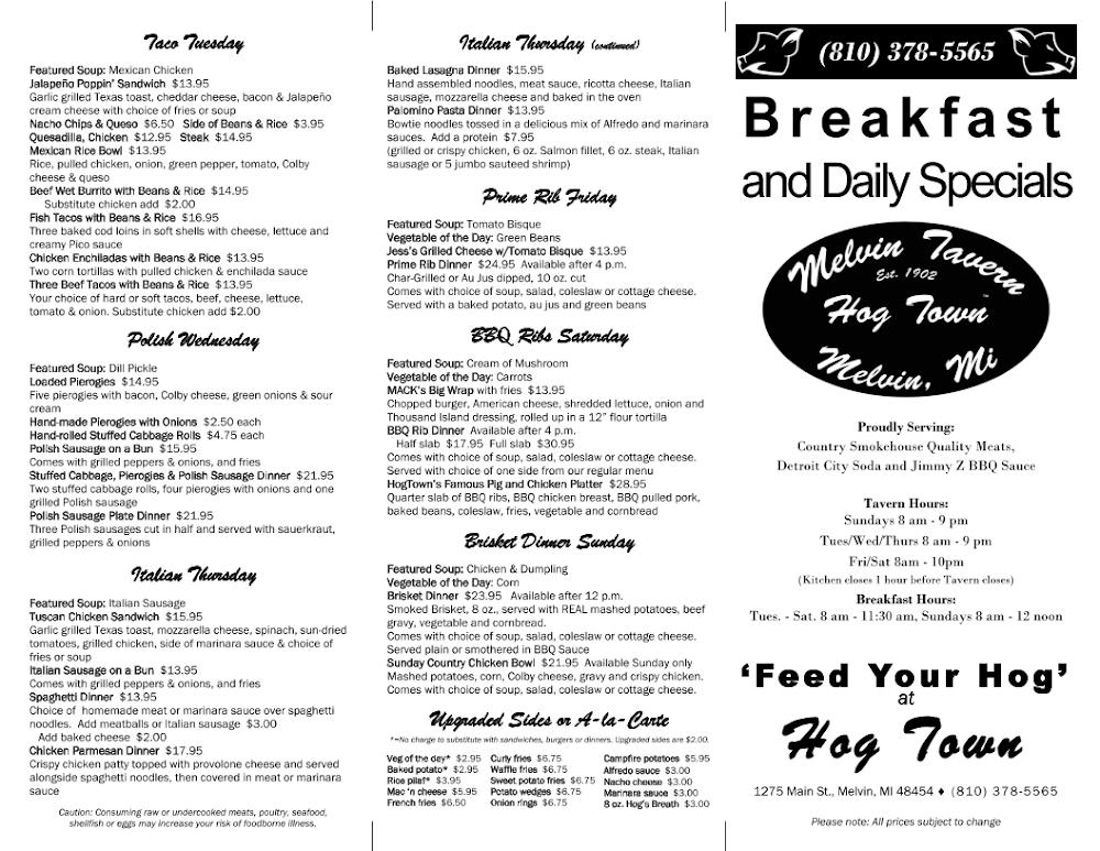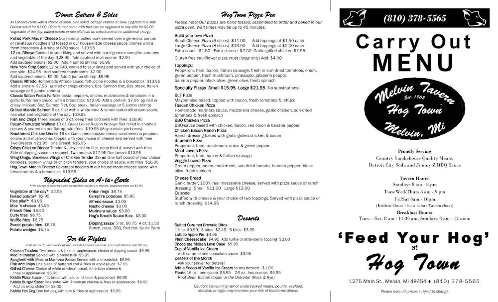 Welcome to Melvin "Hog Town" Tavern, your go-to bar and grill located in the heart of Melvin, MI. Enjoy a warm, inviting atmosphere enhanced by a cozy fireplace and live music that creates the perfect backdrop for any occasion. Our diverse menu features traditional dishes, vegan options, and an impressive selection of local specialties. Savor our excellent cocktails and wide variety of beers while you relax on our accessible patio or take advantage of our takeout and delivery services. Whether you're stopping by for breakfast, lunch, or dinner, Melvin “Hog Town” is the ideal spot to unwind and indulge.